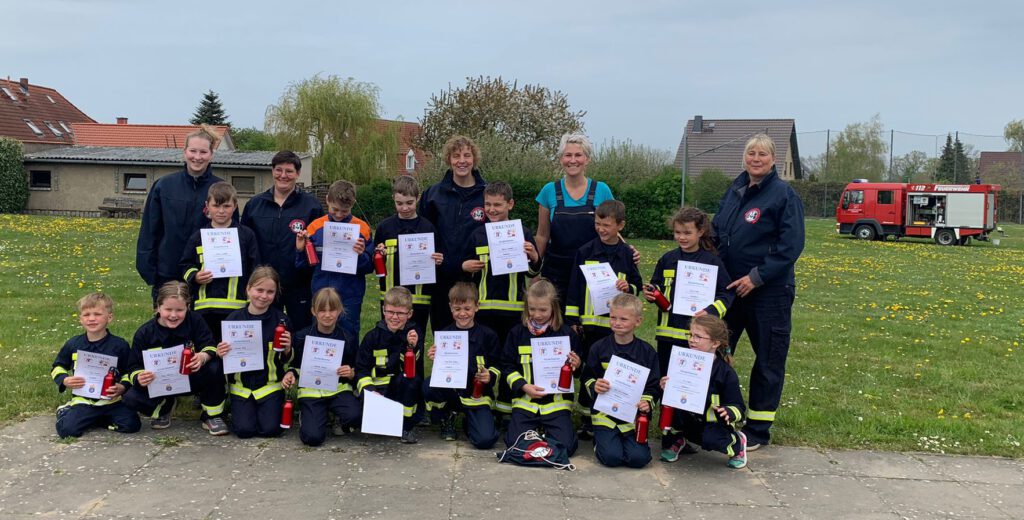 07.05.2022 Abnahme und Verleihung der kleinen Flamme an die Minilöscher Am 07.05.2022 stand für unsere Minilöscher die erste Flammstufe an, die Kinderflamme 1. Beim Notruf wählen,Pflaster kleben, Knoten machen und